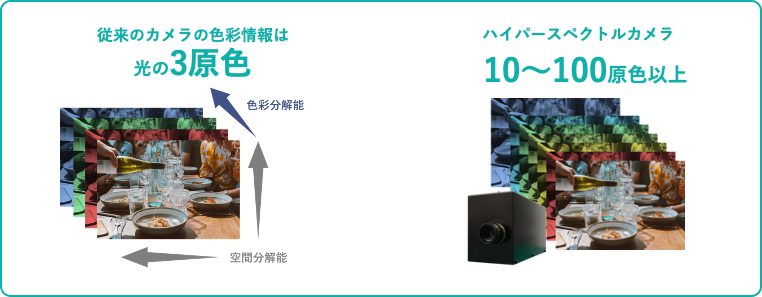ハイパースペクトルカメラは、従来のカメラの色彩情報が3原色であるのに対し、141原色の色彩情報を有し、人間の目では見分けることの出来ない色(=ゴーストカラー※)の違いを見分けることが出来るカメラです。また、従来のカメラとハイパースペクトルカメラの中間ほどの色彩情報を有するカメラとして、マルチスぺクトルカメラがあります。